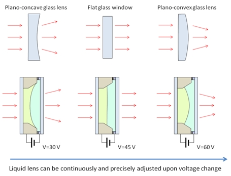 The technology uses the Electrowetting principle and a combination of transparent and optically defect-free liquids to create a lens and change its characteristics in real time. Liquids have been used since 40 years in optical systems for high-end products such as goggles or camcorders, but Varioptic’s innovation is to have created a real-time programmable platform that offers to change the shape of the liquids in a very fast, repeatable, precise and controlled way.