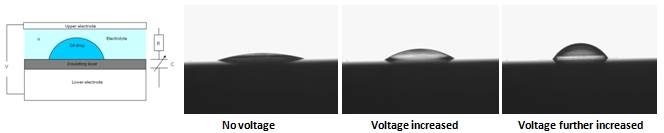 In the drawing below, Electrowetting is explained in a very basic configuration: a drop of oil is deposited on a planar surface , made of a flat electrode covered with a thin insulating and hydrophobic layer, all this being immersed in a water based conducting liquid. Voltage is applied between the flat substrate electrode and another electrode dipped in the conducting liquid (not shown on the photographs).