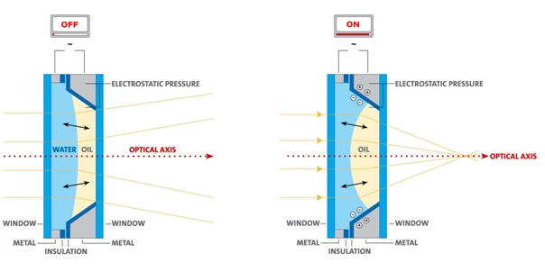 A sealed cell contains 2 liquids which are immiscible, oil and water. The shape of the oil drop is changed by electrowetting. Both liquids are transparent, with different indices of refraction but exactly the same density. The cell contains only those two liquids and this density matching makes the whole lens very stable against mechanical shocks. The liquid lens external shape is fixed, there is no moving part: only the internal liquids change shape. The Arctic lens is used for high performance Auto-Focus: